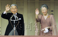 圖為日本天皇、皇后正在向前來祝賀的人們揮手致意。