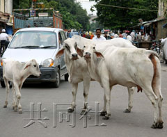 印度路上的牛很多是以前被飼養(yǎng)因產(chǎn)不出牛奶或變老而被拋棄,或是因放養(yǎng)而闖到路上的。在印度禁止食用作為神靈的“牛”肉。就沒有人想要抓那些迷路的牛。即使那些牛在道路中間成為交通的障礙,在路上逆行,市民們也都會避開。