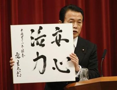 中新網(wǎng)1月6日電 據(jù)星島環(huán)球網(wǎng)報(bào)道,日本首相麻生太郎4日用了39秒鐘時(shí)間寫下了“安心活力”四個(gè)字作為自己新年的執(zhí)政目標(biāo),并于記者會(huì)上進(jìn)行了公布。然而,這一舉動(dòng)并沒(méi)有獲得國(guó)民的掌聲,卻很快引來(lái)了輿論的嘲弄,因?yàn)椴簧偃苏J(rèn)為麻生寫的四個(gè)字中,至少一個(gè)字是錯(cuò)別字。