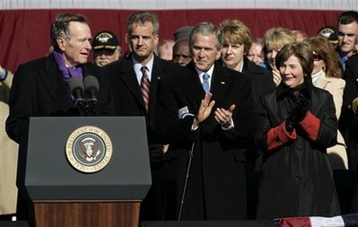 據(jù)“中央社”報(bào)道,布什與親近家人及高層官員,參加核子動(dòng)力航空母艦“布什號(hào)”(USS George H.W. Bush)下水服役儀式?偨y(tǒng)當(dāng)選人奧巴馬1月20日進(jìn)入白宮時(shí),布什將卸下總統(tǒng)職務(wù)。