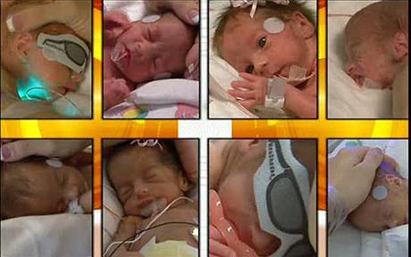 據(jù)東森新聞報道,出生至今兩個星期,八胞胎的母親娜達(dá)雅蘇利曼(Nadya Suleman)通過美國國家廣播公司的鏡頭,把孩子們一一介紹給大眾認(rèn)識。擔(dān)心自己的手太冰冷嚇到孩子,娜達(dá)雅蘇利曼還刻意把雙手搓了搓,才小心翼翼地輕輕撫摸孩子。這八胞胎都非常瘦小,身高可能都只到他們母親雙手手掌相連的長度而已。