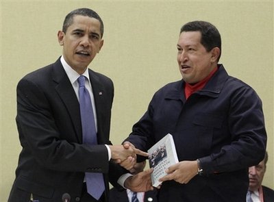 據(jù)香港《明報》報道,查韋斯和奧巴馬在西班牙港出席美洲國家首腦會議,二人于17日首次握手問候,18日在會談前雙方再次握手,奧巴馬用西班牙語向查韋斯問候,查韋斯則贈送給奧巴馬一本烏拉圭作家愛德華多.加萊亞諾的名著《拉丁美洲:被切開的血管》。