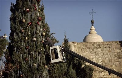 中新網(wǎng)12月16日電 伯利恒當(dāng)?shù)貢r間12月15日,巴勒斯坦居民點(diǎn)亮了一顆四層樓高的圣誕樹,開啟了巴以和平進(jìn)程陷入僵局7年以來最熱鬧的圣誕節(jié)慶祝。據(jù)美聯(lián)社報道,伯利恒當(dāng)?shù)毓賳T表示,由于近期巴以重啟和談進(jìn)程,西岸地區(qū)氣氛空前和諧,今年前往伯利恒的朝圣者和游客人數(shù)可能達(dá)到七年最高峰。