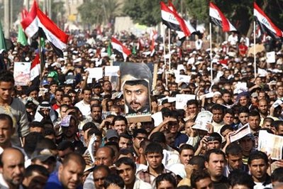 抗議者揮舞著伊拉克旗幟和綠色的什葉派標(biāo)牌,齊聲喊道:“不,不要美國(guó)的協(xié)議!”和“不,不要喪權(quán)辱國(guó)之約!”