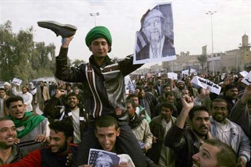 納杰夫地區(qū)的一名示威者用鞋子拍打美國(guó)總統(tǒng)布什的畫像。