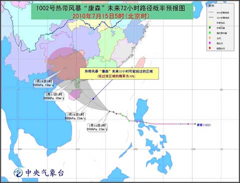 預(yù)計,“康森”將以每小時20公里左右的速度繼續(xù)向西偏北方向移動,強度將有所加強,并逐漸向海南陵水到廣東陽江一帶沿海靠近,將于16日下午到17日凌晨在這一帶沿海登陸。