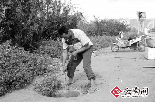 昨日下午,蒙自縣文瀾鎮(zhèn)高家寨的戴橋紅,正拎著一只水桶在紅河大道上找水,他找水的地方是紅河大道上的排污管道。在紅河大道的非機(jī)動(dòng)車道上,許多窨井蓋都不見(jiàn)了,紅河大道兩旁的果農(nóng)們,每天都會(huì)開(kāi)著車或者騎著摩托來(lái)找水。