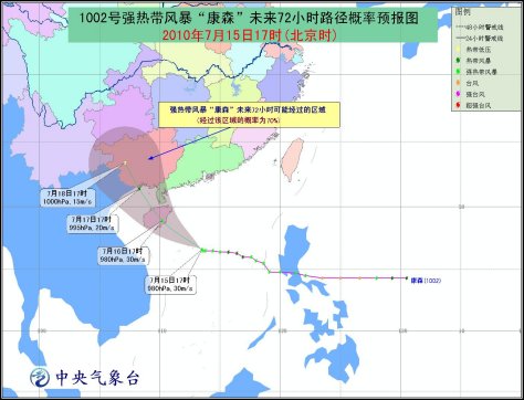 預計,“康森”將以每小時15-20公里的速度向西偏北方向移動,強度還將有所增強,有可能發(fā)展為臺風,將于16日中午到夜間在海南文昌到三亞一帶沿海登陸。