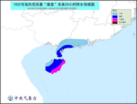 受其影響,15日晚上到16日白天,南海北部和中部、海南省及其沿海、瓊州海峽、廣東西部沿海、北部灣東部海面將有7-9級大風,“康森”中心經(jīng)過的附近海面或地區(qū)的風力可達10-12級;海南、廣東西南部將有大到暴雨,其中海南東部的部分地區(qū)有大暴雨,局地有特大暴雨。