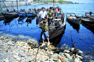 昨日,在大連港事故現(xiàn)場(chǎng)的海面上,十多艘海事清污船正在作業(yè)。當(dāng)天的清污工作主要由海事部門組織,大連軍分區(qū)派出1100名官兵、200名民兵參與清理。