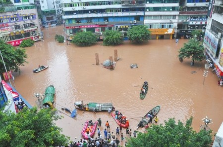 截至昨晚7點半,途經(jīng)達州城區(qū)的洪水水位已達到282.61米,超過警戒水位4.7米,洪水使整個達州城超過1/3的面積進水,濱河路淹到二樓,全城大面積停水,逾5000家門市的貨物轉(zhuǎn)移。達州河市機場也進水。