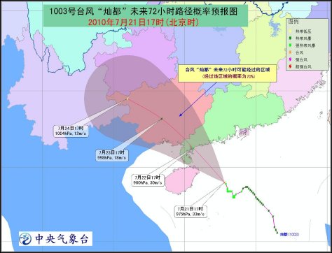 預(yù)計,“燦都”將以每小時10-15公里的速度向西北方向移動,逐漸向海南文昌到廣東陽江一帶沿?拷,并有可能于22日早晨到下午在這一帶沿海登陸。