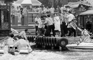 昨天,頤和園舉行了水上救生演練,“游客”昆明湖落水,救援船只在3分鐘內趕到救援(見圖)。此外,昆明湖水上還舉行了模擬游船失火、游客被困以及船上發(fā)現(xiàn)爆炸品的應急演練。