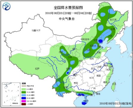 3日20時至4日20時,西藏大部、青海中東部和南部、西北地區(qū)中東部、內蒙古中東部、東北大部、華北、黃淮東部和北部、江蘇南部、浙江東部、福建東部、廣東南部、廣西南部、海南、四川盆地西部、云南、臺灣等地有小到中雨或陣雨,其中,內蒙古東北部和東部偏南地區(qū)、黑龍江西北部和中部偏南地區(qū)、吉林中西部、遼寧西部和中北部、河北東北部和中南部、天津、山東北部、四川盆地西部、甘肅南部、云南西部和南部、廣西南部沿海、雷州半島及海南等地有大雨,部分地區(qū)有暴雨,上述局地并伴有短時雷雨大風等強對流天氣。
