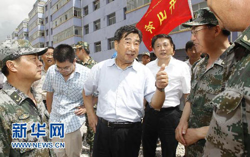 9日中午,回良玉在泥石流形成的淤泥中徒步40分鐘后,乘坐清淤工程車,渡過湍急的洪水,來到舟曲縣城堰塞湖邊,實(shí)地查看堰塞體和白龍江河道淤積、河床抬高情況,了解爆破和挖掘排險(xiǎn)進(jìn)展,并聽取了現(xiàn)場(chǎng)軍地聯(lián)合指揮部的匯報(bào)。