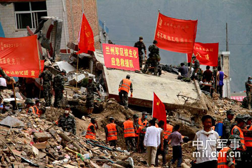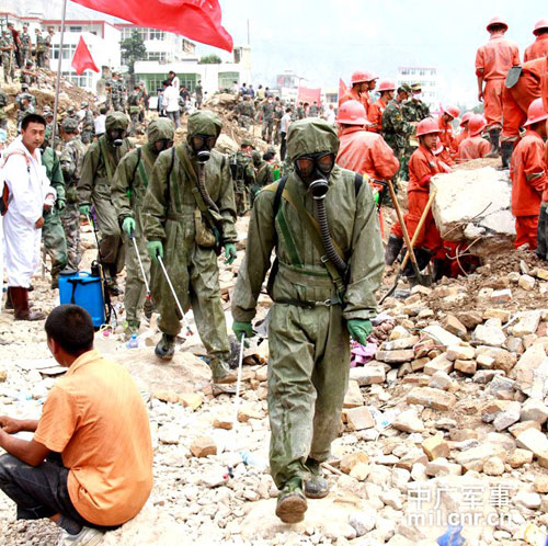 記者在現(xiàn)場看到,蘭州軍區(qū)某集團軍防化團官兵對每名挖出來的遇難群眾遺體進(jìn)行認(rèn)真細(xì)致的消毒、殺菌。核生化應(yīng)急救援分隊的官兵身著密不透風(fēng)的連體橡膠防護服,攜帶手持消毒機對救災(zāi)現(xiàn)場實施噴灑作業(yè),每走幾步,都會大汗淋漓。防化團團長蒲軍禮告訴記者,現(xiàn)在防疫形勢仍然很嚴(yán)峻,因為遇難者遺體挖掘出來后,氣味很大,消毒必須嚴(yán)密組織。為了保障救災(zāi)工作順利進(jìn)行,部隊規(guī)定,只要在災(zāi)區(qū)作業(yè),帶手套、帶口罩、穿長袖要作為一項紀(jì)律嚴(yán)格執(zhí)行。