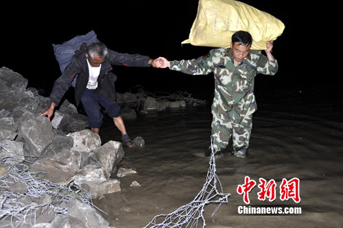 時(shí)間在一分一秒的過去,廖軍支隊(duì)長(zhǎng)果斷下令,全體救援官兵穿著救生衣深入事故地段排成一條直線,由推土機(jī)的反斗將被困群眾載運(yùn)到臨時(shí)通道的安全地帶,隨即救援官兵通過攙扶、背負(fù)、肩扛等方式將被困群眾引導(dǎo)到河水上游的安全處。