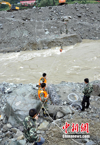中新網(wǎng)映秀8月18日電(郭永全 張浪 鄢銀嬋)18日早6點(diǎn),汶川消防大隊(duì)映秀消防站接到武警水電部隊(duì)求助電話,在位于映秀鎮(zhèn)堰塞湖處處理淤泥沙石拓寬河道的數(shù)十名機(jī)械工人因河道加寬,水流湍急,無法從原來搭設(shè)的繩橋往返對(duì)岸進(jìn)行作業(yè)。