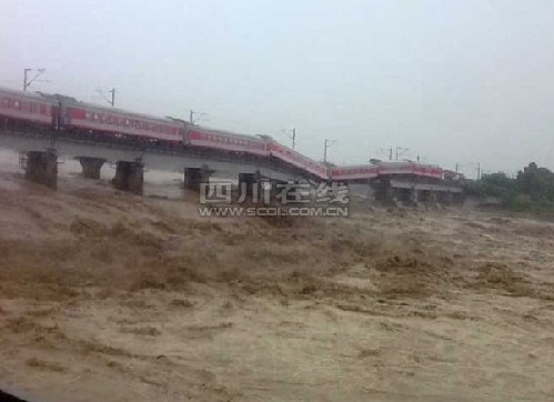 據(jù)廣漢市政府電話報告,鐵路寶成線跨石亭江大橋(廣漢小漢境內(nèi))沖毀兩個橋墩三孔,西安至昆明客運車懸掛橋上,廣漢市已積極組織力量正在進行搶險和轉移旅客。