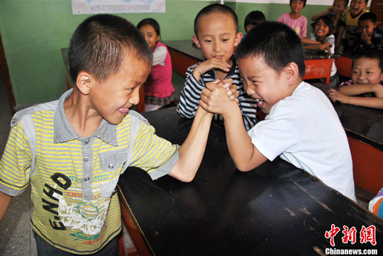 領到書包的小學生喜笑顏開,他們?yōu)榘械母鞣N“寶貝”癡迷,面對記者鏡頭,他們大擺造型,使出渾身的解數(shù)耍寶:掰手腕、擺V字手勢、嘟嘴扮鬼臉……