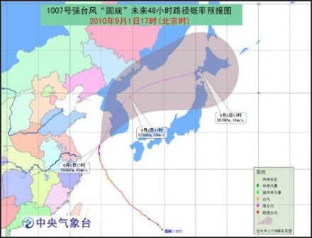 今年第7號臺風(fēng)“圓規(guī)”于9月1日13時在東海北部海面上加強為強臺風(fēng),17時其中心位于韓國濟(jì)州西偏南方大約170公里的海面上,就是北緯33.2度、東經(jīng)124.7度,中心附近最大風(fēng)力有14級(45米/秒),中心最低氣壓為955百帕。