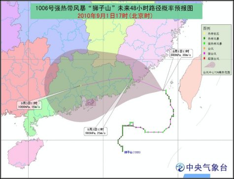 中新網(wǎng)9月1日電 據(jù)中央氣象臺(tái)預(yù)計(jì),強(qiáng)熱帶風(fēng)暴“獅子山”將以每小時(shí)10~15公里的速度向西北轉(zhuǎn)偏西方向移動(dòng),強(qiáng)度還將略有加強(qiáng),并逐漸向廣東汕尾到福建廈門一帶沿?拷瑢⒂诿魅樟璩康缴衔缭谶@一帶沿海登陸。