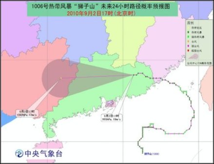 今年第6號(hào)熱帶風(fēng)暴“獅子山”的中心于9月2日11時(shí)由福建省詔安縣移入廣東省饒平縣境內(nèi),17時(shí)“獅子山”位于廣東省興寧市境內(nèi),就是北緯24.1度、東經(jīng)115.7度,中心附近最大風(fēng)力有8級(jí)(18米/秒),中心最低氣壓為995百帕。