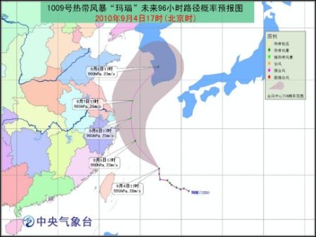 今年第9號(hào)熱帶風(fēng)暴“瑪瑙”的中心9月4日17時(shí)位于浙江象山東南方大約680公里的洋面上,就是北緯25.7度,東經(jīng)127.3度,中心附近最大風(fēng)力有8級(jí)(20米/秒),中心氣壓995hPa。