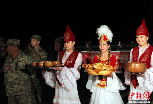 在奧塔爾市火車(chē)站站臺(tái)上舉行的簡(jiǎn)樸而隆重的歡迎儀式上,用中、俄兩種文字書(shū)寫(xiě)的“熱烈歡迎‘和平使命-2010’聯(lián)合反恐軍事演習(xí)中方參演部隊(duì)”的橫幅格外醒目,哈方軍樂(lè)隊(duì)高奏中、哈兩國(guó)國(guó)歌,3位哈薩克斯坦盛裝少女手捧當(dāng)?shù)靥厣拿谰、美食,獻(xiàn)給風(fēng)塵仆仆的中方參演官兵。隨后,站臺(tái)另一側(cè),中方參演部隊(duì)列車(chē)第一車(chē)隊(duì)攜行裝備,也在緊張有序地進(jìn)行卸載。