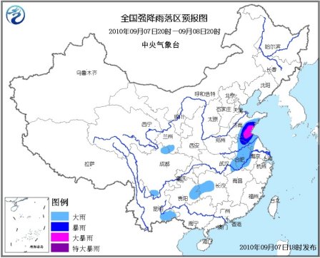 中新網(wǎng)9月7日電 據(jù)中央氣象臺網(wǎng)站消息,中央氣象臺9月7日18時繼續(xù)發(fā)布暴雨藍色預警:9月7日20時到8日20時,山東中南部、安徽大部、江蘇北部和西部、湖北東部、湖南中部偏西地區(qū)、貴州東部、甘肅東南部、川西高原北部、云南東南部等地有大雨或暴雨,其中,山東東南部和江蘇北部的局部地區(qū)有大暴雨;上述部分地區(qū)并伴有短時雷雨大風等強對流天氣。