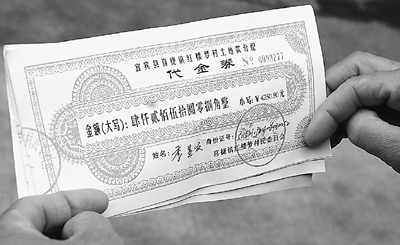 券面是白底、印有橘黃色花紋。最上面兩行的字是:宜賓縣喜捷鎮(zhèn)紅樓夢村土地款分配代金券;第三行是金額:4250.80元,分別有大小寫;第四行是持有人的姓名和身份證號碼;最后一行落款是發(fā)代金券的單位:喜捷鎮(zhèn)紅樓夢村民委員會,并蓋有公章。