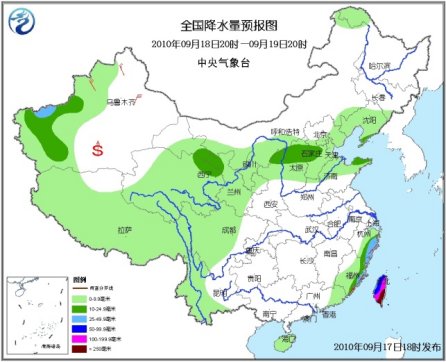 18日20時至19日20時,新疆西部、青海大部、西藏大部、甘肅大部、寧夏、陜西北部、內蒙古西部偏南和東北部、遼寧大部、華北大部、山東北部和東部、四川中西部、云南中西部、浙江東部、福建大部、臺灣、廣東東部、海南等地有小到中雨或陣雨,其中,浙江東南部沿海、福建東部沿海、臺灣、新疆南疆西部等地有大雨或暴雨;臺灣東部和南部的部分地區(qū)有大暴雨,局部特大暴雨;上述地區(qū)局部并伴有短時雷雨大風或冰雹等強對流天氣。新疆大部、甘肅西部、內蒙古西部等地有4~6級風;南疆盆地的部分地區(qū)有揚沙或浮塵。臺灣海峽、臺灣以東洋面和以南海域將有7~9級大風,部分海域的風力將有10~12級,臺風中心經(jīng)過的附近洋面將有13~16級大風;東海南部海域將有7~8級大風、陣風可達9~10級;南海東北部海域將有6~8級偏西或西北風。