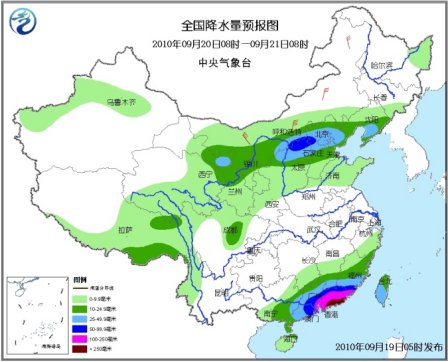 中新網9月19日電 據中央氣象臺消息,未來三天,全國降水范圍較大,其中,甘肅河西地區(qū)東部、內蒙古河套東部、陜西北部、山西北部、河北中北部、北京、天津北部、遼寧中南部、四川盆地西南部、湖北東部、湖南北部和南部、安徽中南部、江蘇西南部、浙江東南部、江西南部、福建東部和南部、臺灣、廣東、廣西大部有大雨或暴雨;臺灣大部、福建東南部、廣東大部、廣西東部等地有大暴雨或特大暴雨。上述地區(qū)局部并伴有短時雷雨大風或冰雹等強對流天氣。
