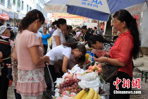 10時許,舟曲縣城街道上的行人明顯要多于往常,顯得很熱鬧,許久沒聽到的叫賣聲不絕于耳。街道兩側的店鋪早早的開門營業(yè),沿主街道一側臨時設立的集貿市場上人聲鼎沸,蔬菜、水果、肉食、小吃鋪滿了一整條街。