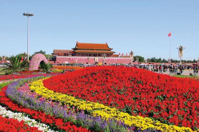 一場(chǎng)秋雨過后,北京天空分外湛藍(lán)。今年主題為“花開盛世”。天安門廣場(chǎng)中心呈現(xiàn)出一朵巨型立體“牡丹”。花壇中心依然保留傳統(tǒng)的中心噴泉景觀,演繹出直徑50米“盛世牡丹”的造型。東西兩側(cè)綠地對(duì)稱布置現(xiàn)代、簡(jiǎn)潔、艷麗的大色帶,并點(diǎn)綴有高低起伏、五色斑斕的花島。