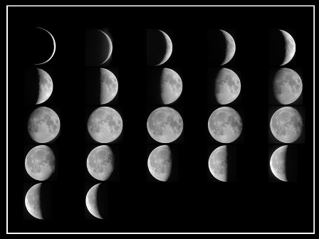 月球位于日、地之間時叫做“朔”,月球暗的半個球朝向地球,我們看不到它。朔之后的一兩天,鐮刀狀的新月在傍晚西方的天空中露面,凸面向著落日的方向。以后月球相對于太陽逐漸向東移動,亮的部分日益擴展。五六天以后成了半圓形,這時的月相稱為“上弦”,日落時月球在天子午線附近。再經(jīng)過7天,便到了“望”(滿月),月球與太陽遙遙相望,我們看到的是一輪明月于傍晚東升,在晨曦中西落,將黑夜照耀得如同白晝一般。滿月以后,圓輪的西部日益虧缺。到“下弦”時,呈半圓形,月球到半夜才升起。和上弦月相反,下弦月是東邊半個圓被照亮。下弦以后,半圓繼續(xù)虧缺,成為黎明前掛在東方天空的一絲殘月。它愈來愈接近太陽,終于跑到和太陽相同的方向,朔又來臨了。