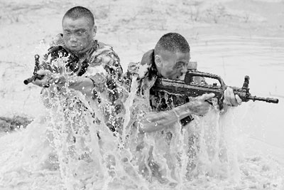 特勤中隊(duì)的士官宣海軍出發(fā)了,他從低矮的鐵絲網(wǎng)下迅速爬過(guò)碎石和泥潭,然后躍過(guò)熊熊燃燒的火墻,幾步加速,翻過(guò)被稱為“步步高”的三組橫木;此時(shí),又一道15米寬的壕溝橫在面前,他抓住了兩根高低距離為2米的粗大繩索,要從不斷搖擺的繩子上“越”過(guò)這道天塹。