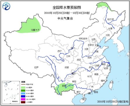 10月29日20時至30日20時,新疆北部、內(nèi)蒙古東北部局部、黑龍江西北部等地有小雨(雪)或雨夾雪;云南中南部有小雨或陣雨,全國其它大部地區(qū)為晴到多云天氣。東海大部海域、臺灣海峽、臺灣以東洋面和以南海域、南海東北部、中部和西南部海域?qū)⒂?~8級、陣風9~10級的東北風。另外,黃海南部海域?qū)⒂?~6級東北風;南海西北部海域、北部灣將有5~7級的東北風。