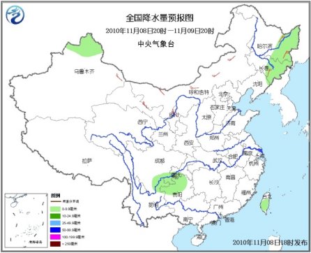 10日20時至11日20時,內蒙古中東部、黑龍江南部、吉林、遼寧中北部等地有小到中雪或雨夾雪;河北北部、山西北部、四川東部和南部、重慶、貴州大部、云南中北部、湖北西部、湖南西北部及海南等地有小到中雨。西北地區(qū)中東部、內蒙古大部、華北、東北、江淮、黃淮等地有4~6級風,局地陣風7~8級。南海東北部和中部海域將有6~7級、陣風8級的東北風。