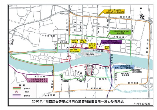 11月12日廣州亞運會開幕式將在天河區(qū)珠江新城南側(cè)的海心沙島舉行,廣州市政府、市公安局、市交警支隊9日晚召開了新聞通氣會,通告了當(dāng)夜海心沙島周邊道路及珠江巡游兩岸道路分時分段交通管制的詳細措施。
