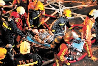 由于火災(zāi)撲救時間較長,一些消防救援人員也已經(jīng)體力不支。記者看到,一名消防人員險(xiǎn)些昏倒在現(xiàn)場,旁邊的120救援人員和民警立即趕上,扯開他的衣服,并立即對他展開急救。另一名消防人員由于不堪大火高溫的炙烤,他的頭盔里裹著一條濕毛巾,而他依然背著一名已經(jīng)昏迷的被困市民踉踉蹌蹌地跑出火災(zāi)現(xiàn)場。旁邊的同事見狀立即上前扶住被困市民,這名消防人員隨即跌坐在了積水的地面上。
