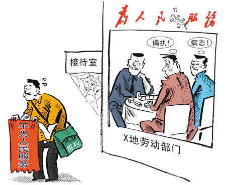 曾在無錫新區(qū)某公司工作的周力向當(dāng)?shù)貏趧颖U媳O(jiān)察大隊實名舉報,要求公司補(bǔ)償加班費(fèi)。但勞保監(jiān)察隊負(fù)責(zé)人稱,從勞動的相關(guān)法律法規(guī)來看,想要從勞動部門解決此事,已經(jīng)很難。為此,周力給勞動部門送上一幅“不為人民服務(wù)”的錦旗。(現(xiàn)關(guān)報道見今日本報8版)