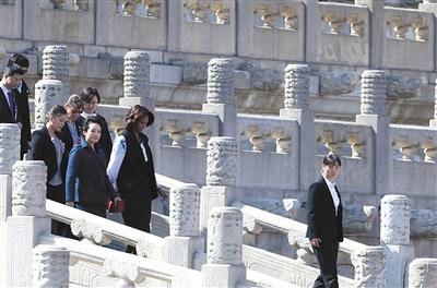 【回訪】 昨日12時(shí)許,游客已可正常游覽故宮。一名故宮工作人員稱,第一夫人來訪時(shí),太和殿及西路清場(chǎng),保留故宮東路給游客參觀。一名游客表示,在神武門處看到了彭麗媛一行的車隊(duì),“彭麗媛拿著紅色的包!彼f,他看到彭麗媛和米歇爾曾下車與工作人員握手,隨后離開。新京報(bào)記者 黃穎
