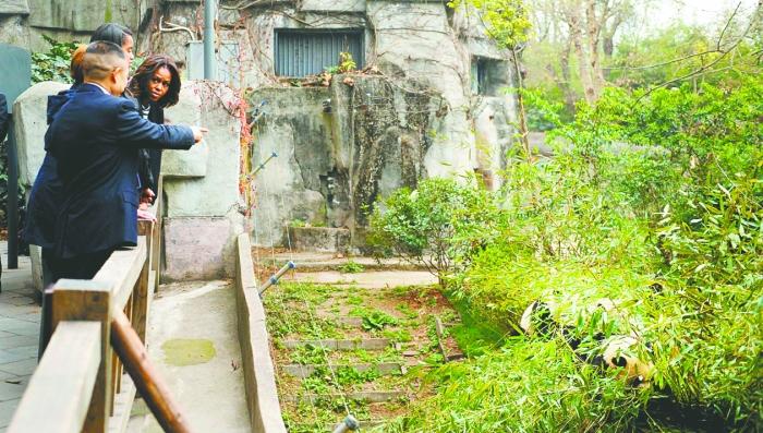 首先在美國(guó)第一夫人面前亮相的,是22歲的大熊貓媽媽“莉莉”和5只1歲多的大熊貓寶寶。它們半躺在地上一邊剝竹子皮一邊大口咀嚼的“招牌”動(dòng)作,讓米歇爾和家人“邁不開(kāi)步”,足足停留10多分鐘,斃麃喓退_沙靠在欄桿上目不轉(zhuǎn)睛地看,不時(shí)被它們的憨態(tài)和好胃口逗笑。