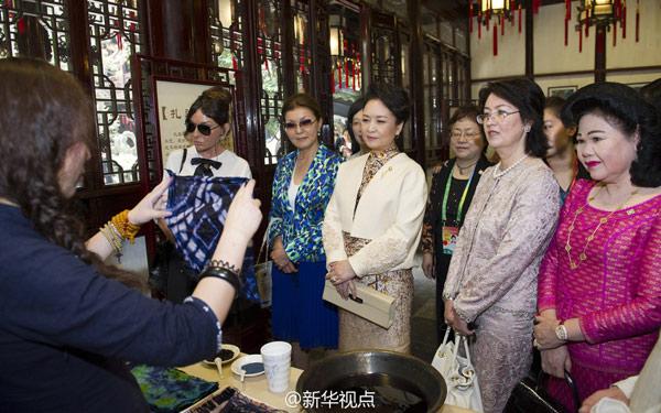 彭麗媛和貴賓們?cè)谠@靜觀的展臺(tái)前駐足停留,聽取介紹。彭麗媛不時(shí)拿起面塑、扎染布等傳統(tǒng)手工藝品給貴賓們欣賞!稗r(nóng)民畫用的是什么顏料?”“木版水印和版畫有什么區(qū)別?”“扎染布會(huì)褪色嗎?”……大家紛紛提問,同非物質(zhì)文化遺產(chǎn)傳承人親切交流。