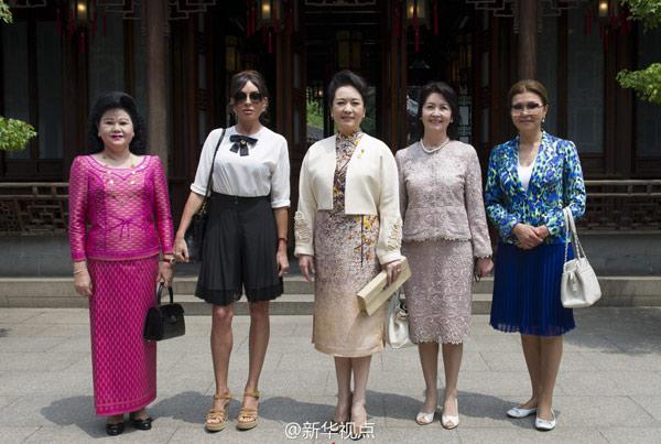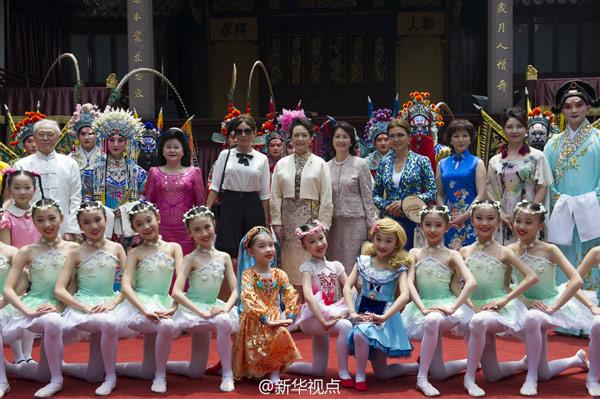 彭麗媛和貴賓們到上海豫園,參觀金山農(nóng)民畫、面塑、顧繡、木版水印、扎染等展示,欣賞少兒歌舞《茉莉花》、昆曲《牡丹亭》選段、滬劇與二胡《燕燕做媒》、太極·古琴《高山流水》、京劇選段《梨花頌》等演出。