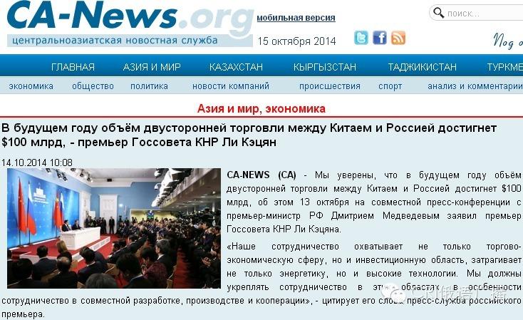 中亞新聞社:中俄雙邊貿(mào)易額將達到1000億美元,而中俄合作對中亞地區(qū)的發(fā)展具有決定性影響,因此,中亞媒體格外關注兩大國的合作動向。