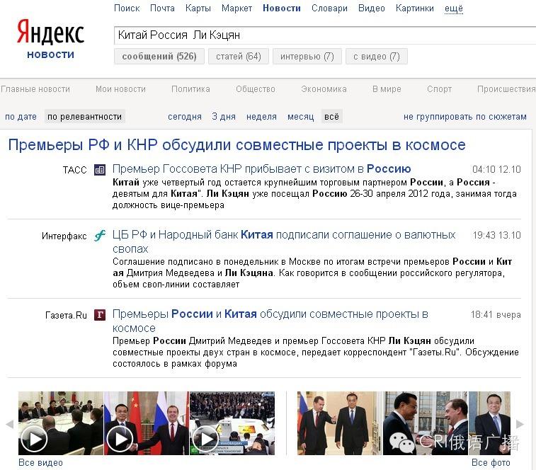俄羅斯最大的搜索引擎Yandex.ru:當在這里輸入“中國”、“俄羅斯”、“李克強”等詞條的時候,你能夠看到數(shù)以千計的消息,內(nèi)容涵蓋了李總理訪俄期間的所有活動與話題。