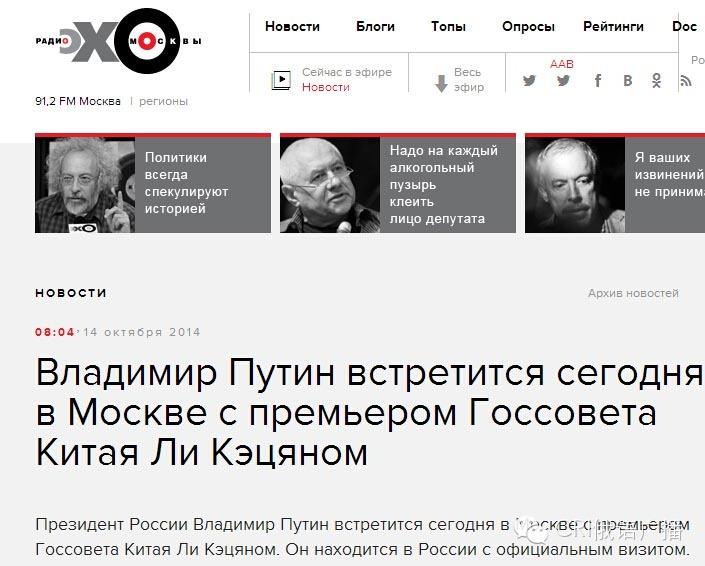 “莫斯科回聲”廣播電臺:在會見李克強時,普京表示,將在亞太經(jīng)合組織成員國領導人非正式會晤期間,與習近平主席在北京舉行會晤。在不到一個月的時間內(nèi),兩國高層領導先后會面,其重要意義不言而喻。