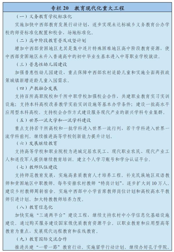 深化教育改革,增強(qiáng)學(xué)生社會(huì)責(zé)任感、法治意識(shí)、創(chuàng)新精神、實(shí)踐能力,全面加強(qiáng)體育衛(wèi)生、心理健康、藝術(shù)審美教育,培養(yǎng)創(chuàng)新興趣和科學(xué)素養(yǎng)。深化考試招生制度和教育教學(xué)改革。推行初高中學(xué)業(yè)水平考試和綜合素質(zhì)評(píng)價(jià)。全面推開中小學(xué)教師職稱制度改革,改善教師待遇。推動(dòng)現(xiàn)代信息技術(shù)與教育教學(xué)深度融合。依法保障教育投入。實(shí)行管辦評(píng)分離,擴(kuò)大學(xué)校辦學(xué)自主權(quán),完善教育督導(dǎo),加強(qiáng)社會(huì)監(jiān)督。建立分類管理、差異化扶持的政策體系,鼓勵(lì)社會(huì)力量和民間資本提供多樣化教育服務(wù)。完善資助體系,實(shí)現(xiàn)家庭經(jīng)濟(jì)困難學(xué)生資助全覆蓋。
